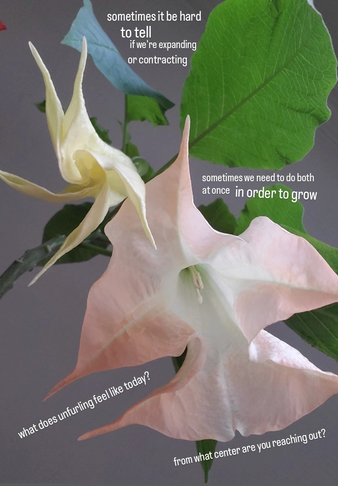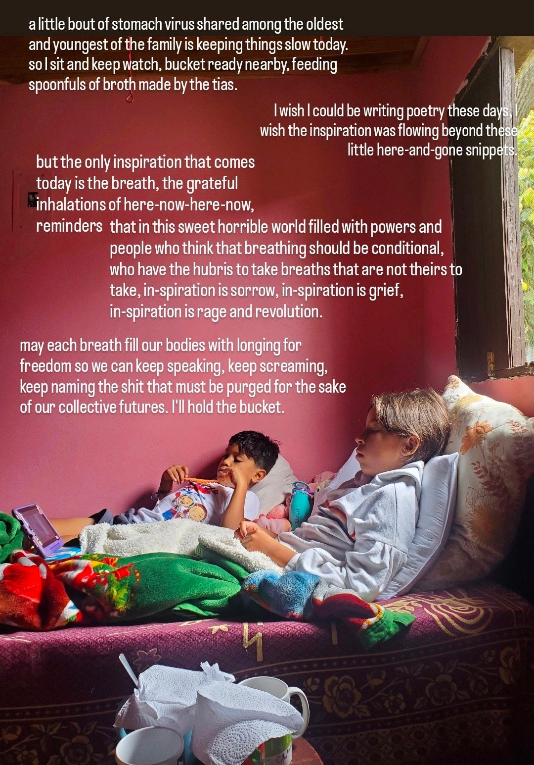 in the fullness of pushing at our edges, leaning with all our weight, digging our feet in, committing our lives to the ongoingness of impossibility— ease arrives when you bring you & you & you & you & you & we push where we can, pull how we can, cook what we can, care when we can… because we will find at some point that what we thought was eternally closed gives, it jumps into place like a pop-up tent that all of a sudden becomes itself & now we can stop trying to pry it open.